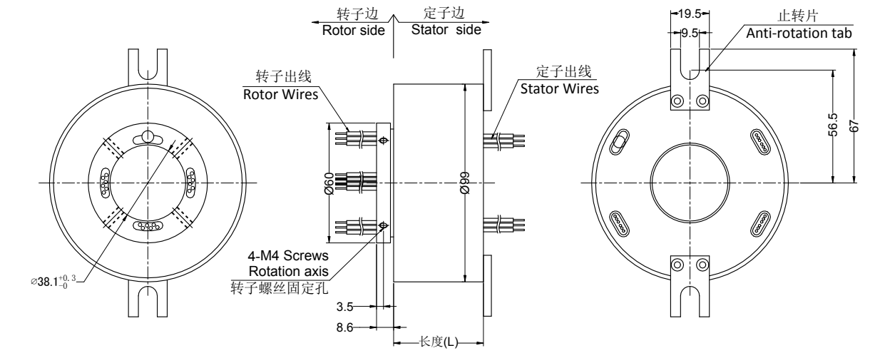 • · 工业总线滑环,RS422滑环,RS485导电滑环集电环通孔直径为38.1mm(1",适用于<=38.1mm)的标准系列整体式精密工业总线滑环