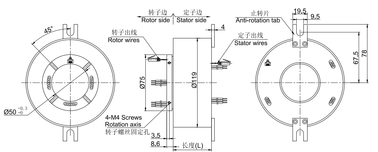 • · ME2501系列千兆以太网滑环,1000M网线滑环,内孔50mm,外径为标准119mm的紧凑型整体式结构的1通道100M/1000M 以太网整体式精密导电滑环。