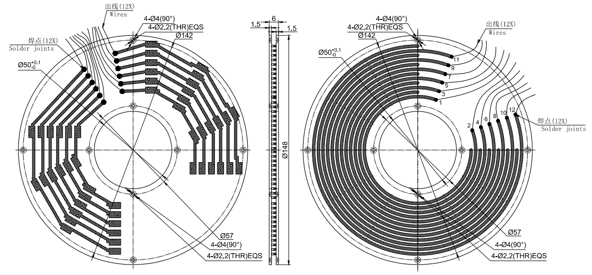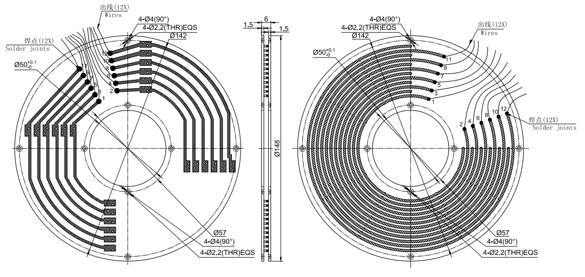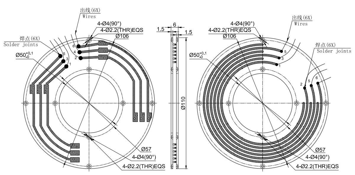 • · MPCB050系列超薄盘式滑环,创新性使用PCB基材,最薄可达5.8mm,采用超硬镀金处理,超厚铜箔工艺,最大电流可达10A, 定子线和转子线对应使用彩色导线,简化了安装和连接。