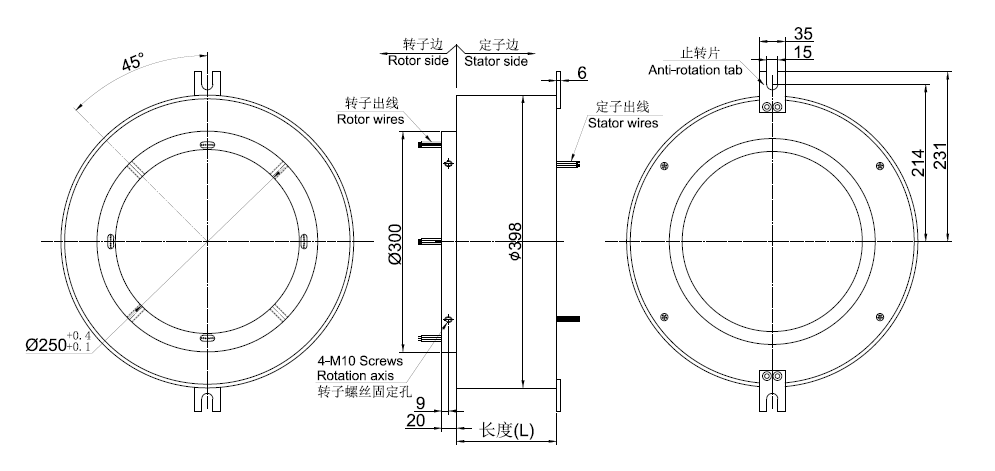 • · 通孔直径为250mm(适用于<=250mm)的标准系列整体式精密导电滑环。*注意:如需<250mm的内孔,可顺利获得加内衬轴套解决。