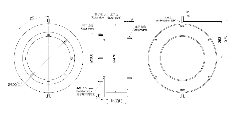 • · 通孔直径为300mm(适用于<=300mm)的标准系列整体式精密导电滑环。*注意:如需<300mm的内孔,可顺利获得加内衬轴套解决。