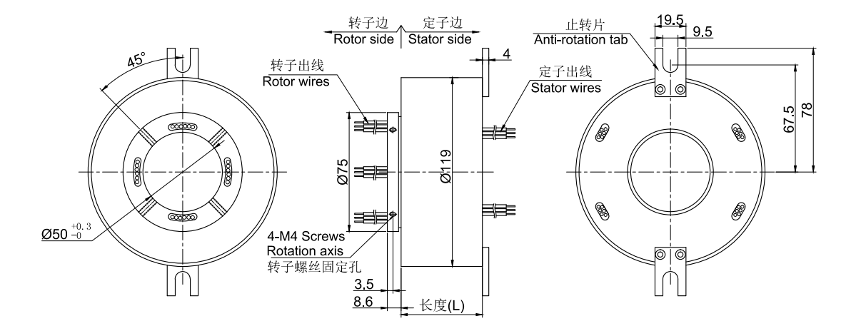 注:以上的各种规格的导电滑环,电路旋转连接器,电旋转接头,10A和 信号(5A)可以任意组合,详细请咨询客服。可在标准产品上进行非标定制滑环,请咨询客服。 标准图纸