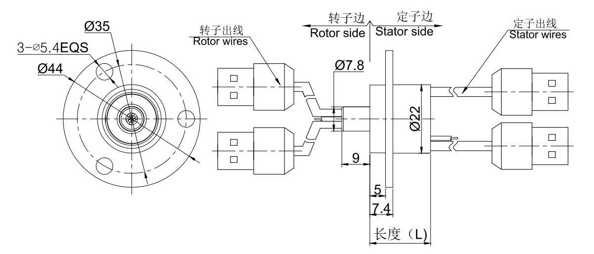 • · MUSB1222系列以太网滑环, 实心带法兰设计, 外径为22mm整体式结构的1通道USB1.0/USB2.0整体式精密导电滑环,